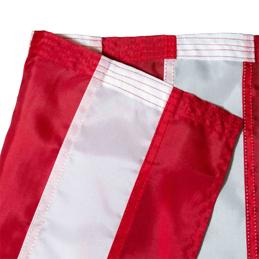 Single-Reverse Construction – Constructed from a single layer of fabric, so the design is visible on both sides. The front reads correctly, while the reverse displays the design reading backward when viewed from behind. This is the standard construction used in the U.S. flag industry.