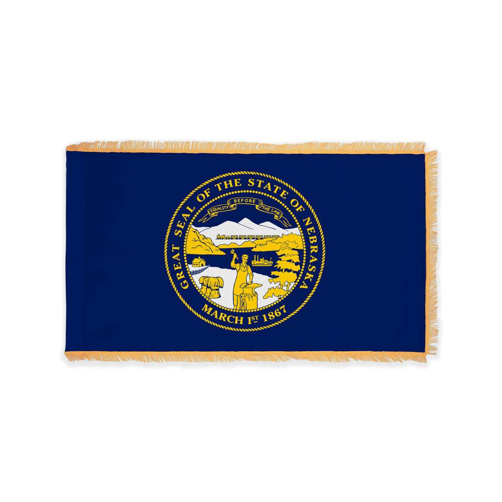 Celebrate Nebraska’s heritage with the official Nebraska State Flag, finished with ceremonial gold fringe for a distinguished indoor display.