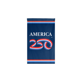 The America250™ nylon banner features a bold blue background with clean “America” lettering and a flowing red, white, and blue “250.”