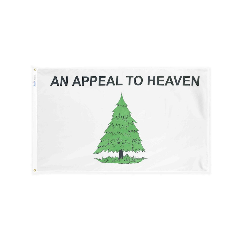 The 3'x5' nylon Washington's Cruisers Flag, also known as the "Pine Tree Flag" or the "Appeal to Heaven Flag" features a green pine tree on a white field under the motto "An Appeal to Heaven."